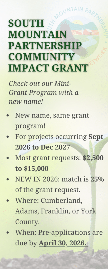 Funding for the South Mountain Partnership’s Mini-Grant Program is provided by a grant from the Community Conservation Partnerships Program, Environmental Stewardship Fund, under the administration of the Department of Conservation and Natural Resources, Bureau of Recreation and Conservation. The Application Trail Conservancy administers the Mini-Grant Program on behalf of the South Mountain Partnership.