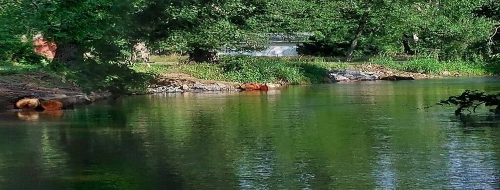 Several of the in-stream structures that were designed by the Pennsylvania Fish and Boat Commission (PA Fish and Boat) are shown above. In all, the PA Fish and Boat installed 10 structures during the last week of June 2023. A number of One-Section and Two-Section Log Framed Stone Deflectors, J-Hook Devices, and random boulders were placed at strategic points in the Yellow Breeches to reduce bank erosion, increase the flow of water, and provide cover for fish and other aquatic life in the stream. The John W. Gleim Jr. construction company provided the heavy equipment expertise for the in-stream construction effort. CVTU volunteers and the PA Fish and Boat crew anchored the logs to the streambed with rebar and good old fashion sledgehammer work. Each structure was backfilled with stone and then topsoil was added to further stabilize the structure and provide a foundation for the growth of grasses and bushes on each structure.